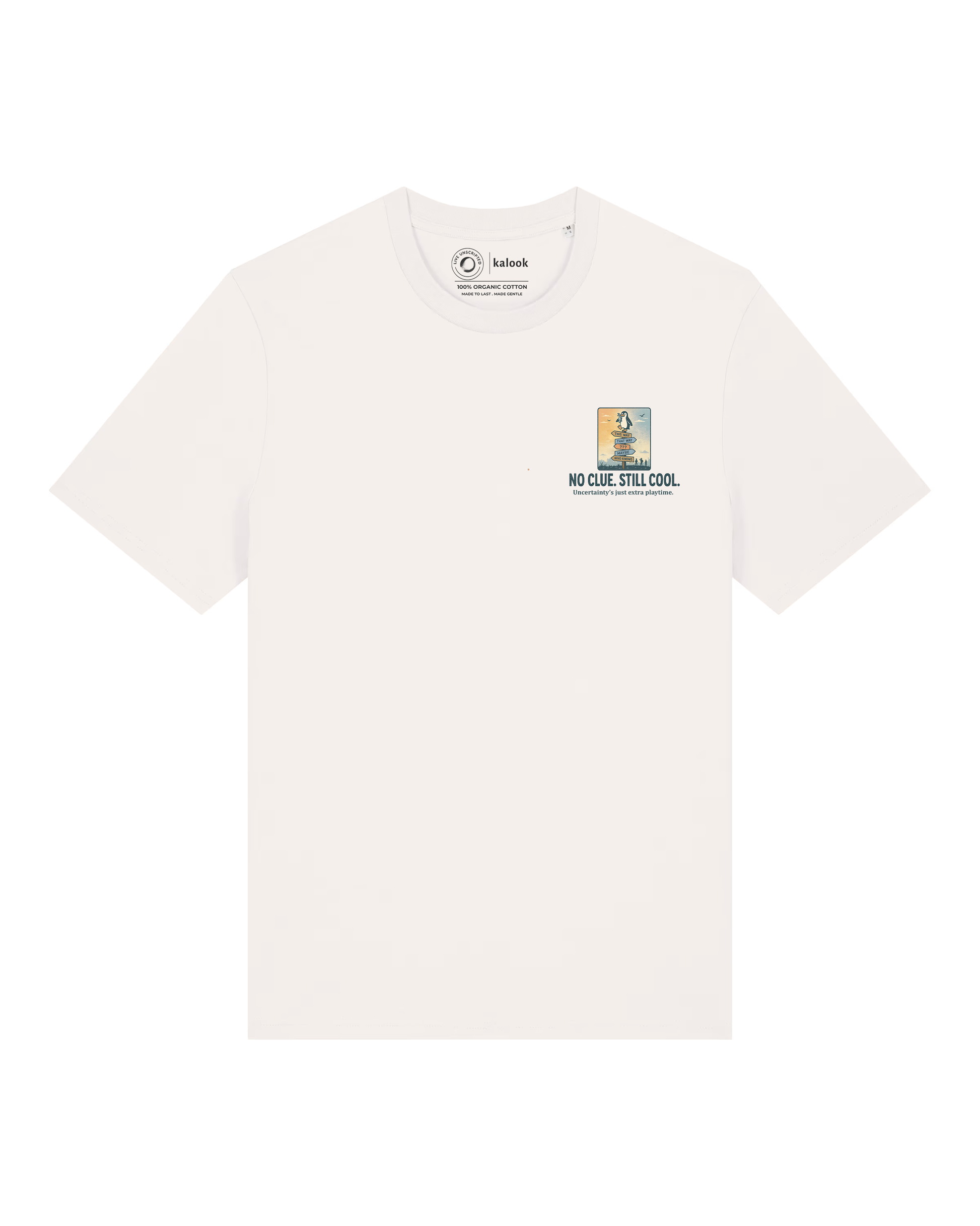 Uncertainty’s just part of the game — doesn’t mean you can’t stay easy in it. No Clue. Still Chill. is an organic cotton tee stamped with a bold signboard print, a reminder that not knowing what’s next can still feel steady.